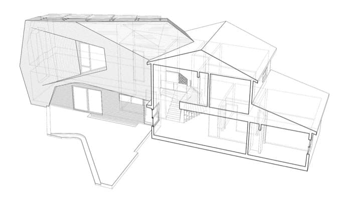 El cuerpo nuevo añadido a la vivienda posee una forma que puede parecer caprichosa. Se debe al tamaño, posición, y orientación que necesitaba tener el faldón del tejado para alojar los paneles solares. Además, hay que tener en cuenta que se necesitaba una superficie de 42m2.
