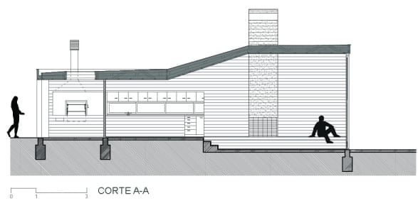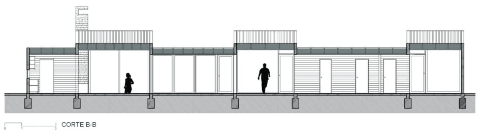Algunas áreas de fachada están completamente acristaladas, y las más soleadas permanecen protegidas por un porche. Para el piso se empleó un pavimento local (gres de batuco), y toda la carpintería es de madera. Entre las medidas sostenibles adoptadas, hay que destacar las siguientes: