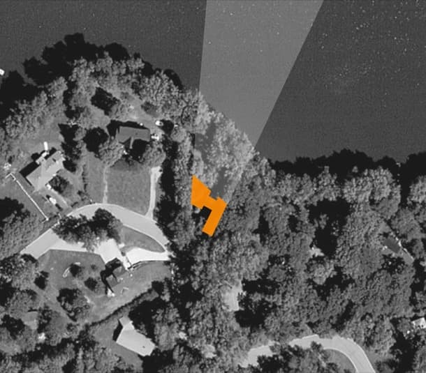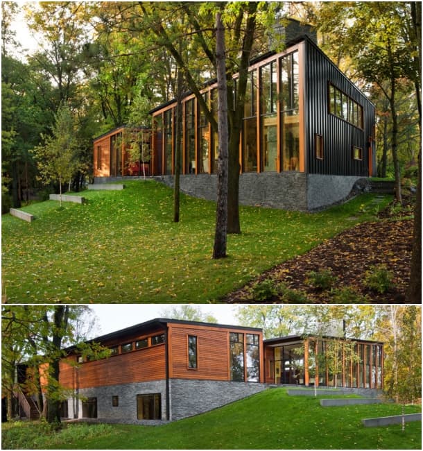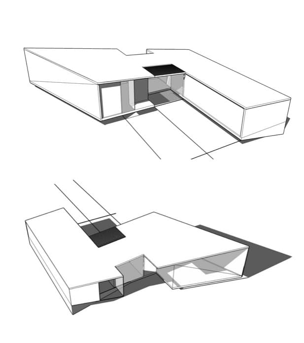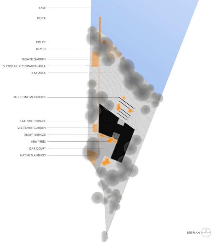 Hay 2 volúmenes principales, uno para la zona de día (oeste) y otro que contiene el garaje y dormitorios (este). Están unidos por una zona intermedia muy permeable visualmente. Este núcleo crea una secuencia de espacios, delimitados por puertas correderas de vidrio. Vemos un porche, un corredor que conecta los dos volúmenes, otro porche (con chimenea), y finalmente una terraza desde la que se puede bajar al lago.