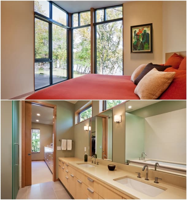 Esta parte de la Casa Farquar Lake es prácticamente una pieza rectangular alargada. Su planta superior se organizada con un distribuidor, conectado con el resto de la vivienda mediante un corredor. Este espacio central tiene varios armarios empotrados; comunica por un lado con el garaje, que tiene capacidad para tres vehículos; por el lado opuesto se accede al dormitorio principal, que es una suite con un amplio vestidor, y cuarto de baño. Este dormitorio también disfruta de buenas vistas, pues dispone de ventanas de suelo a techo. Desde la habitación para el lavado de ropa se puede entrar también al baño.