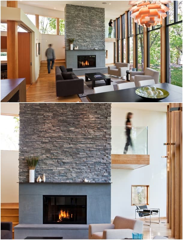 Todo el fondo del volumen oeste está destinado a la zona de estar y el comedor. No hay problema en que toda su fachada esté acristalada, porque da al norte. Eso aporta además una buena panorámica del lago. Por si eso fuera poco, se ha creado una especie de mirador tras la chimenea.