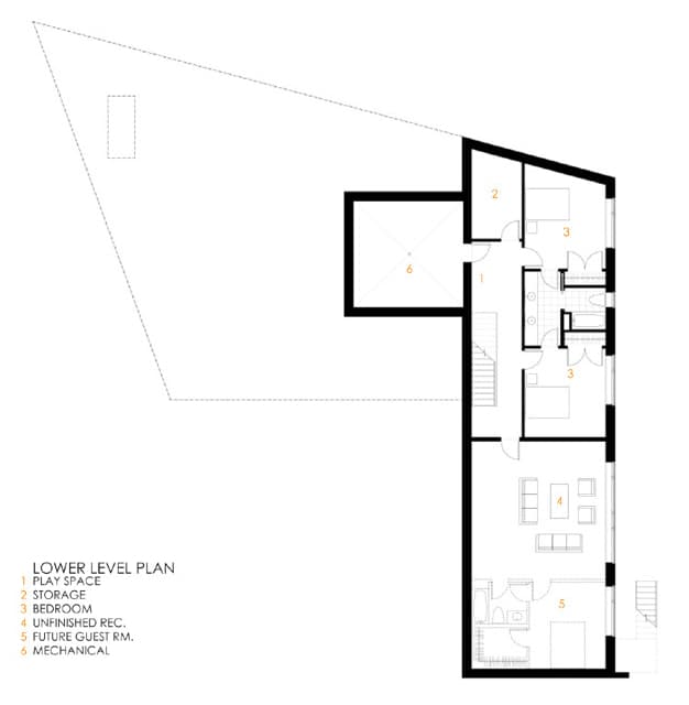La planta inferior está en el volumen este de la casa. Aquí hay un cuarto de instalaciones, almacén, y dos dormitorios que comparten un cuarto de baño. A pesar de tener puerta a cada habitación, el baño mantiene separada la zona del inodoro + bañera. El resto de esta planta es un espacio reservado para una futura ampliación. En ella se ubicará una sala con un cuarto de invitados al fondo, además de otro baño.