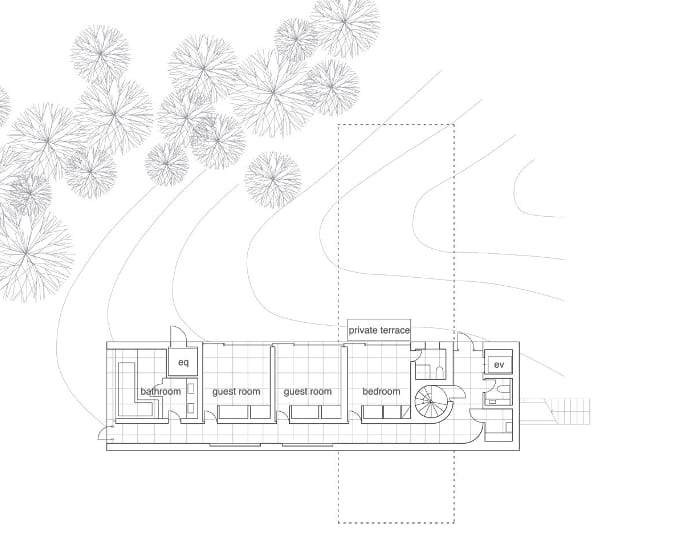 La planta de los dormitorios es bastante oscura, pues sólo recibe luz desde el final del corredor, a través de una surrealista puerta de cristal que da al vacío exterior. El baño principal sí tiene toda la fachada de vidrio, así como cada una de las habitaciones. El dormitorio principal posee una terraza privada y un aseo propio.
