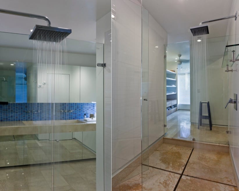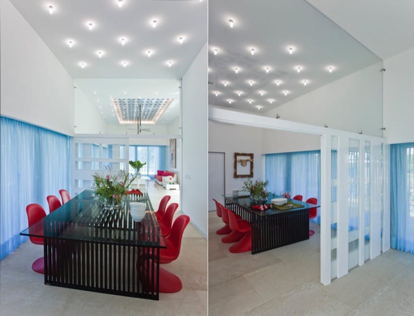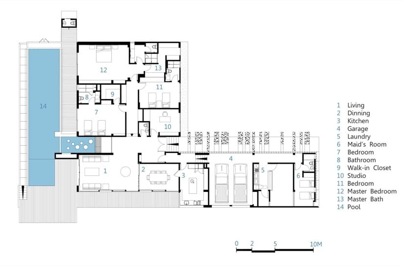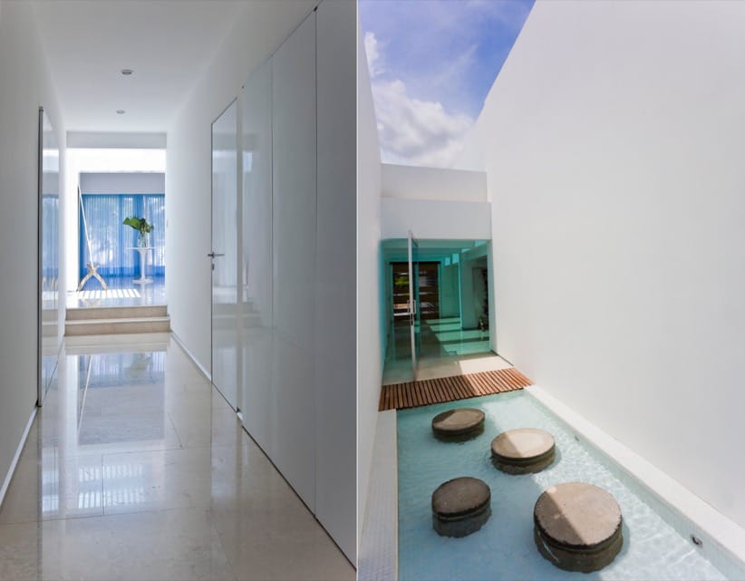Por el lado opuesto al de la entrada, el vestíbulo tiene una gran puerta de vidrio por la que se accede de manera muy divertida hasta la piscina. Es una lámina de agua con bloques cilíndricos de hormigón. La piscina es alargada, y tiene límites desbordantes a ambos lados. Junto a ella hay varias terrazas de madera en las que disfrutar al aire libre.