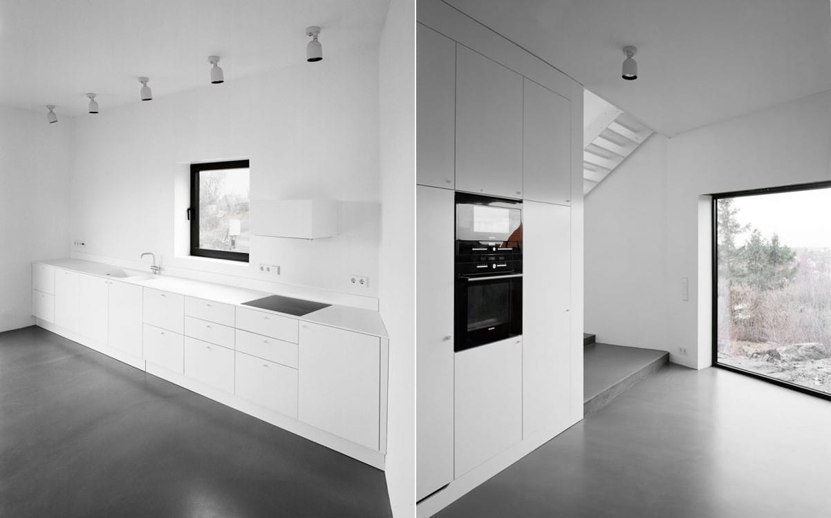 Las ventanas tienden a ser cuadradas, salvo las más grandes, que además arrancan desde el piso. En la cocina hay una pared de armarios, donde se ha encajado el horno. El resto son muebles bajos, llamando la atención la ausencia de una pared revestida de algún material fácil de limpiar. En la sala de estar hay un estufa, y una librería blanca que ocupa toda la pared.