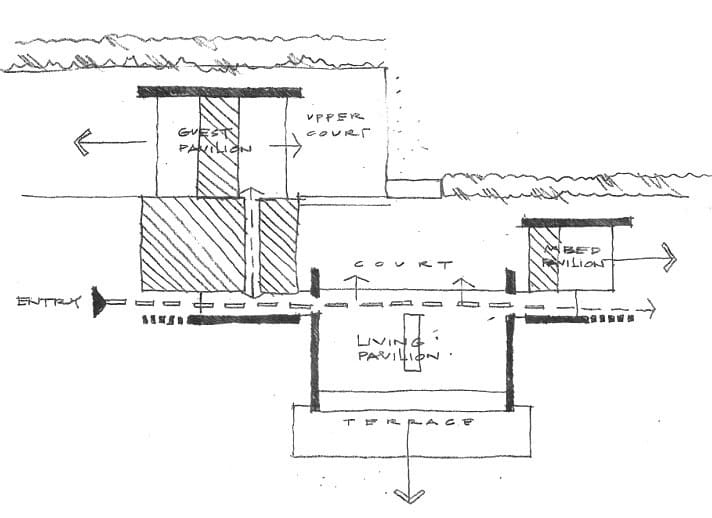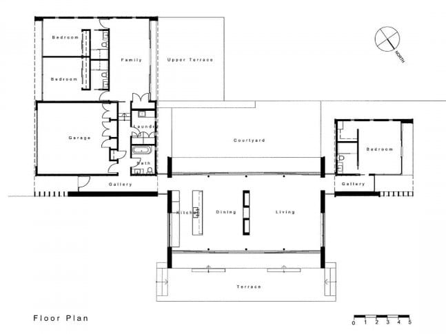 Entender la Casa Dixon es bastante sencillo. Es una casa de una planta que está organizada con 3 pabellones, dejando un patio abierto central. Uno de esos pabellones está formado por el dormitorio principal; otro funciona como un anexo para invitados junto al garaje; el pabellón central contiene los espacios de vida en común.