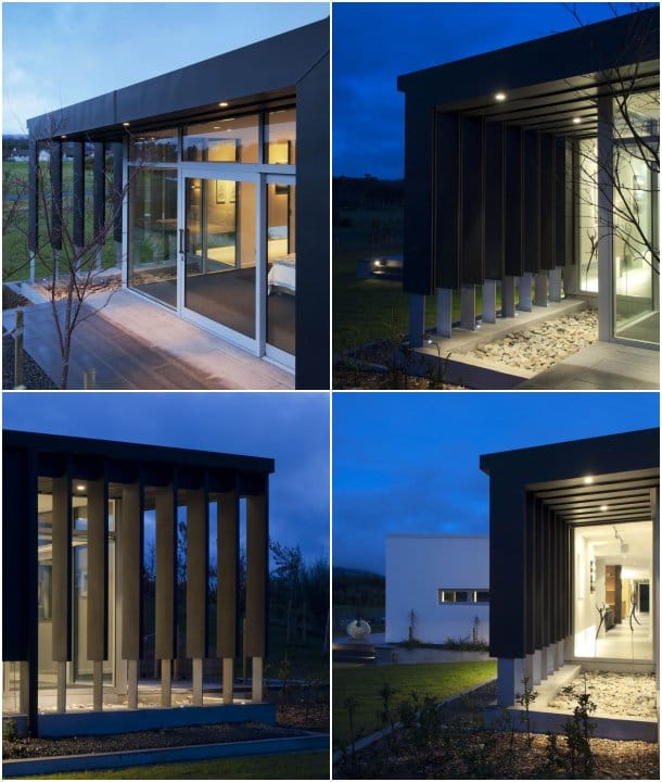 A pesar de tener grandes fachadas acristaladas, se encuentran bien protegidas de la radiación directa solar, mediante vuelos de cubierta, elementos fijos y otros móviles. Gracias a ello, desde cualquier parte de la casa se puede disfrutar de amplias vistas. Los pabellones extremos están revestidos de zinc, así como el cuerpo de la chimenea del salón principal. El resto está pintado de blanco.