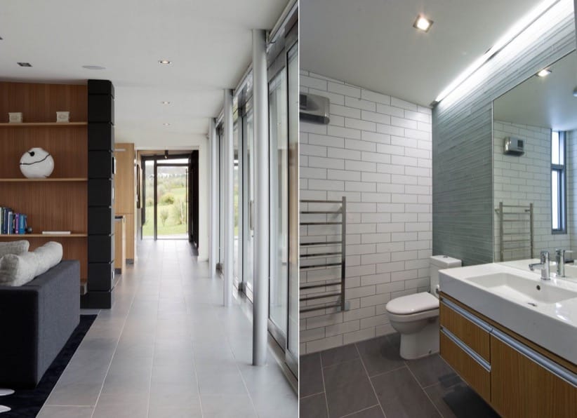 Este pabellón se compone de un único espacio para la cocina, comedor, y sala. Dispone de fachadas opuestas completamente acristaladas que ofrecen buenas panorámicas hacia el paisaje. Unas grandes puertas correderas hacen que estos espacios de vida se extiendan hacia las terrazas.