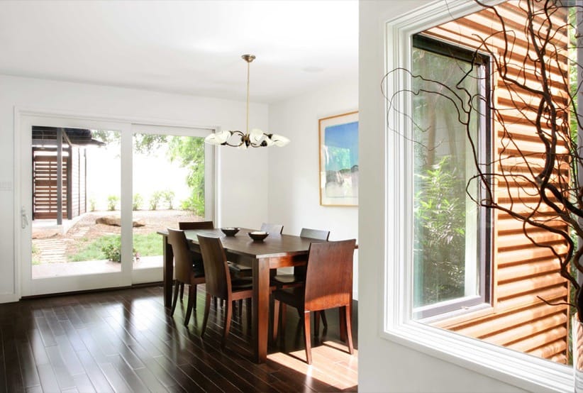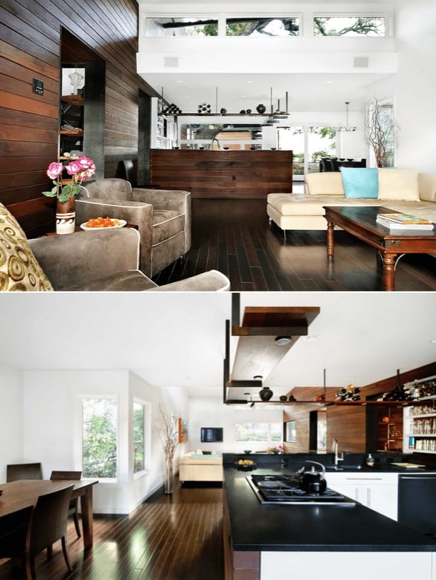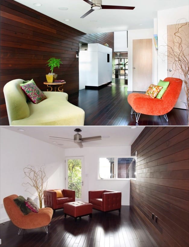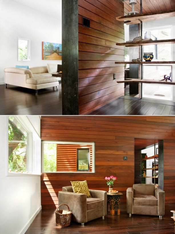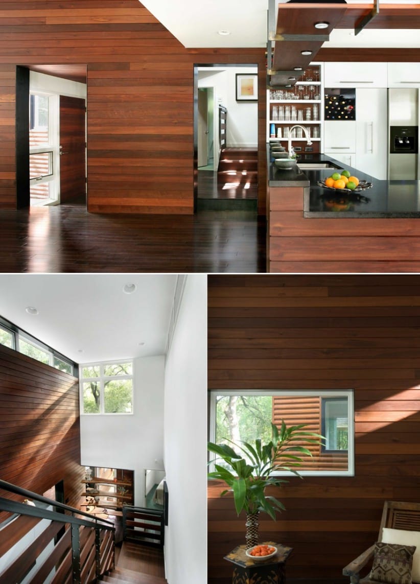 Uno de los puntos más interesantes de la Eva Street Residence es el revestimiento de madera. Nos referimos tanto al aplicado hacia el exterior como en muchas superficies de su interior. Se completa con unos suelos de bambú oscuro muy atractivo. Se empleó también un revestimiento en fachada con láminas corrugadas de acero corten. Hay que acercarse para distinguirlo de la madera, porque ambos tienen el mismo color.