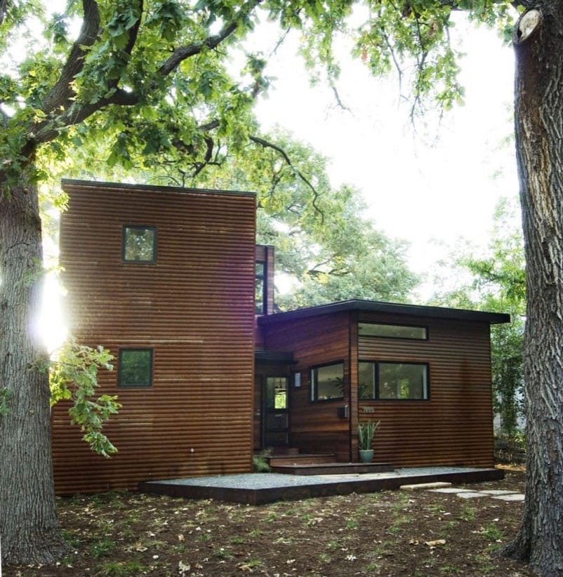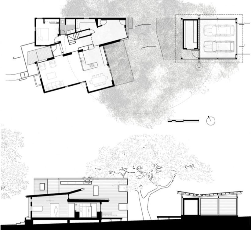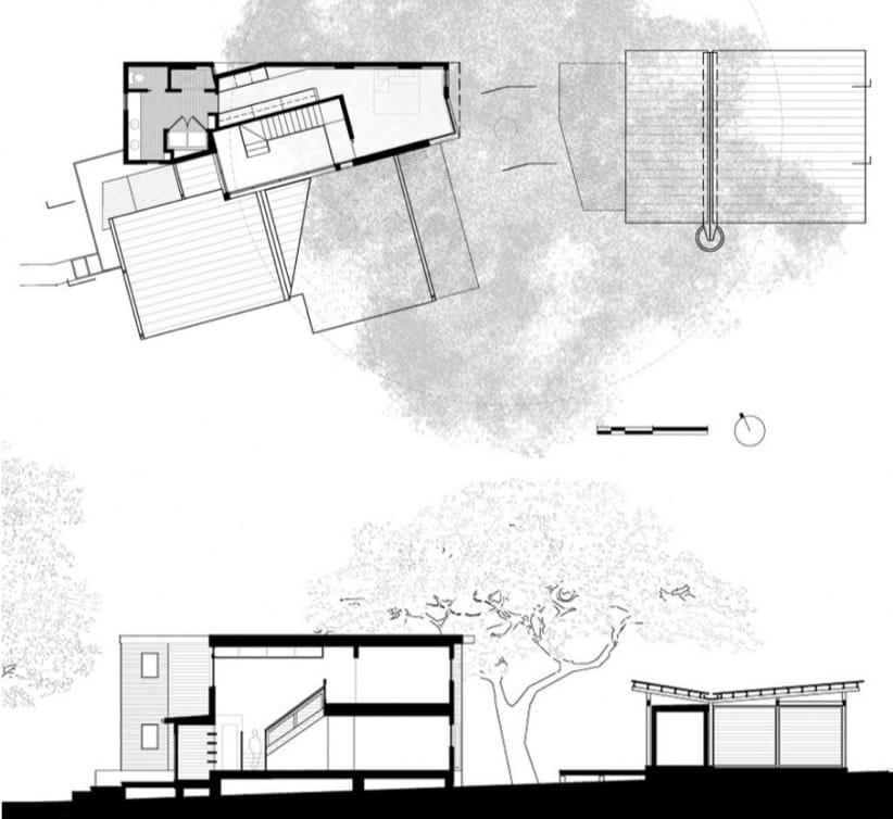 Esta vivienda unifamiliar del sur de Austin (Texas) tuvo como mayor reto el convivir con un viejo roble de más de 150 años. El árbol estaba situado justo en el centro de la parcela, y había que preservarlo. Esto explica que la Eva Street Residence acabara adquiriendo una determinada geometría dentro del lote. Pero este hecho no sólo se nota en su planta, sino también en las diferentes alturas de sus volúmenes.