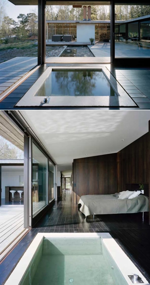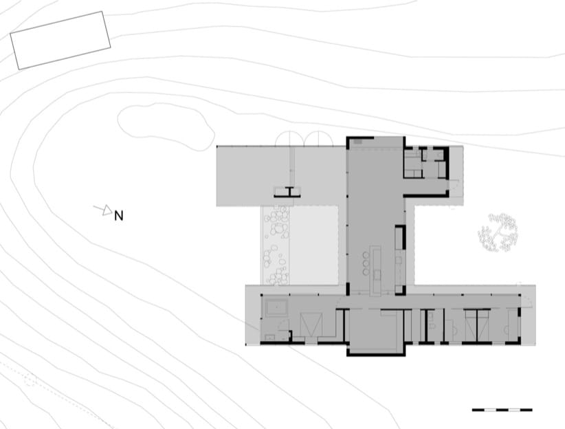 La disposición en H en esta vivienda implica la aparición de unos patios. Estos espacios protegen de los vientos dominantes a las dependencias principales. Según se puede apreciar en el plano de planta, un ala se ha ocupado con tres dormitorios; el ala del lado opuesto sirve como vestíbulo de entrada, aseo, y sauna. Es un volumen que se prolonga más allá de la sala de estar, creando un espacio exterior resguardado por la cubierta, y por uno de sus laterales. Sirve como sala abierta familiar, para disfrutar al aire libre la mitad del año, pues tiene chimenea.