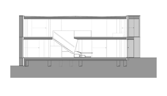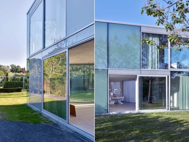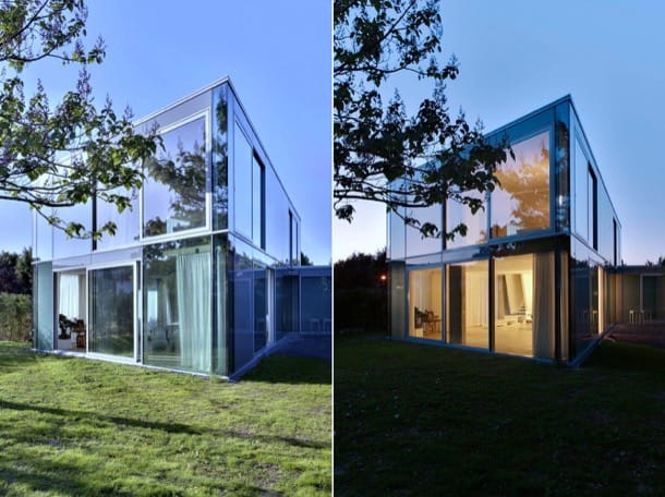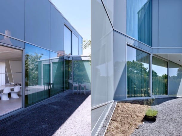 Hacer una casa con toda la fachada de vidrio puede parecer todo un atrevimiento, y un error. Pero en realidad se cuida mucho en este proyecto la privacidad. Algunos de sus paneles acristalados son opacos, y el resto se puede controlar con cortinas. Ese juego de transparencia/opacidad del edificio transmite hacia el exterior diferentes tonalidades de azul turquesa.