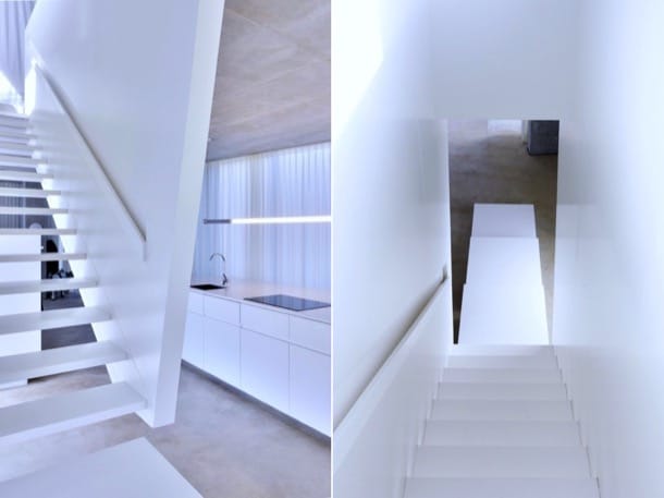 En el interior de la H House encontramos acabados de hormigón visto, con muebles y sanitarios en blanco. Pero probablemente el elemento protagonista es la escalera. Está diseñada como un elemento arquitectónico muy original que queda colgado del techo. Es como si de un mueble más se tratara. Precisamente sus tres primeros peldaños se pueden utilizar como muebles auxiliares para la sala. En la planta superior, la escalera se transforma en otro mueble blanco, para la zona de estar de los dormitorios.