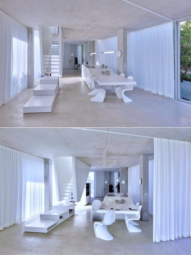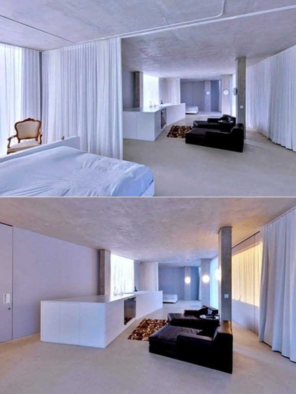 Dentro de la H House las cortinas también cumplen con una función importante. Añaden privacidad a los dormitorios, y crean divisiones temporales en cada uno de los lofts. Para ello se ha dispuesto en el techo un raíl que sirve de guía para las cortinas. Se puede ver en algunas fotos, y en los planos de planta (línea de puntos).