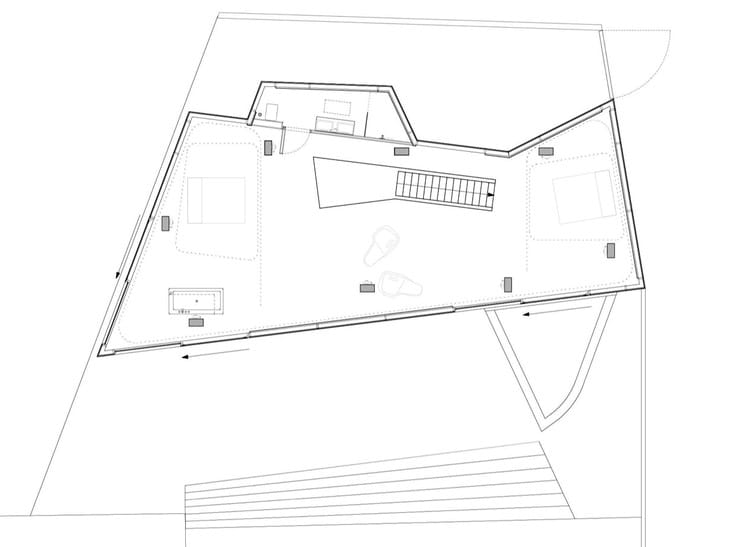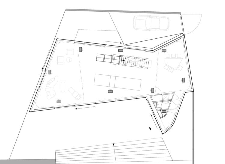 Describir la distribución de la H House va a ser un ejercicio bastante rápido y sencillo. Solo hay que decir que la planta baja es un espacio diáfano para la zona de vida. Y que arriba hay otro loft similar, con dos camas, una en cada extremo. Ambas plantas dibujan una silueta irregular. En el piso inferior, la cocina ocupa una posición centrada, igual que la escalera. Es un mueble-isla blanco con fregadero, placa de cocinar, y armarios en la parte inferior. Posee un elemento en voladizo que funciona como tablero para las comidas diarias. Debajo de la escalera hay un bloque de armarios para la cocina, que incluye varios hornos (ver galería de fotos). Hay un comedor más formal en el extremo norte, con una mesa de diseño irregular. El resto de este nivel conecta con el jardín (al sur de la parcela): es la zona de estar. La H House tiene un apéndice en la planta baja, destinado al aseo y armarios.