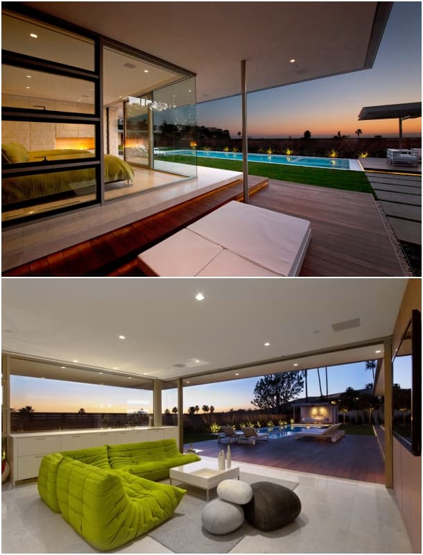Los dormitorios de los hijos e invitados están orientados al patio rectangular. La suite principal lo hace sobre la zona de la piscina, con vistas a la panorámica lejana del océano. Su cuarto de baño ventila a un jardín de meditación.