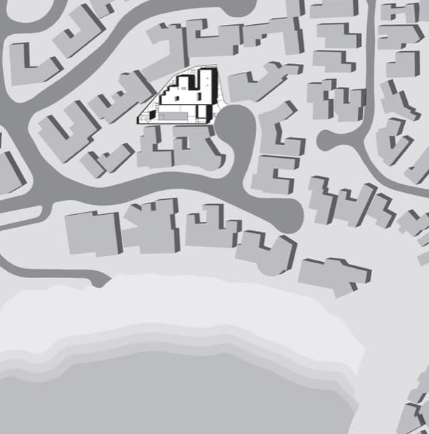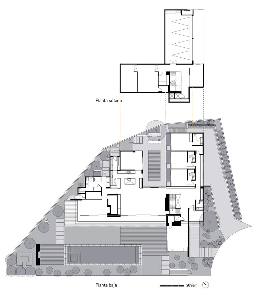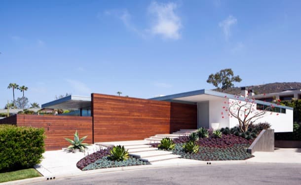 Ya desde la calle esta casa aislada está expresando su excelencia. Vemos un muro de quince metros de longitud, revestido con madera de teca (procedente de bosques sostenibles). Este bello elemento sirve como telón de fondo a un espectacular jardín de cactus. Una suave y blanca escalinata nos conducirá a la entrada, que está protegida por un gran voladizo. Esto coloca a la vivienda 1.65m por encima de la rasante de la calle, y facilita la aparición de un sótano para el garaje. Pero también tiene un valor añadido: desde su interior se puede ver el Océano Pacífico.