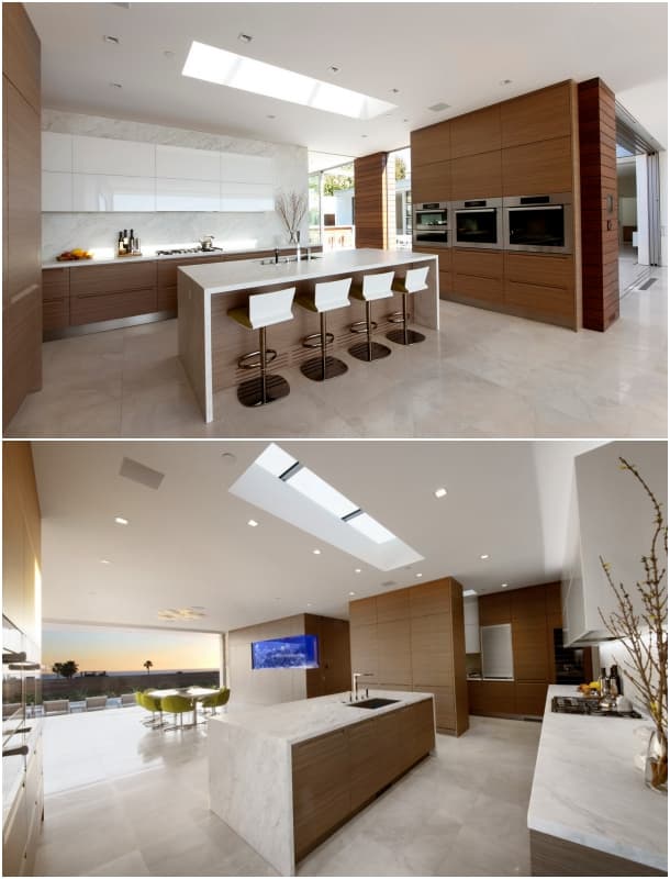 A pesar de tener iluminación lateral por el patio, la cocina ocupa una de las zonas más oscuras de la casa. Por ese motivo los arquitectos tuvieron el buen criterio de introducirle más luz natural mediante dos claraboyas. Muebles altos blancos y revestimiento de mármol crean un hermoso contraste con los muebles y paredes de madera. Esto hace que se mantenga un estilo sobrio y minimalista. Como espacio anexo está la típica lavandería.