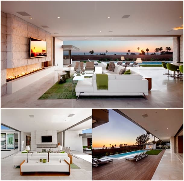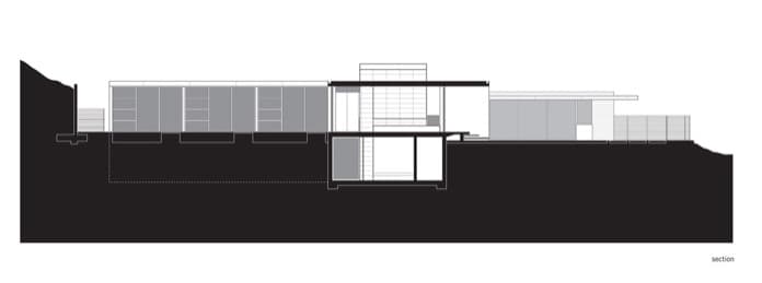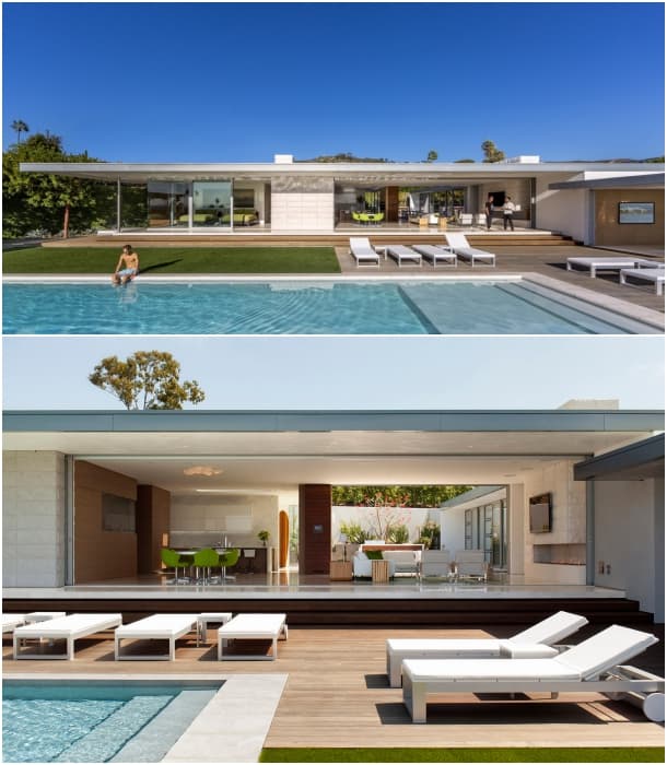 En líneas generales, esta casa aislada se caracteriza por su horizontalidad, y fachadas de grandes puertas correderas1. Esto hace que desaparezca la frontera entre el espacio interior y el exterior, apreciándose en el flujo existente entre el salón y el jardín de la piscina. Crea por tanto una interesante sucesión de espacios, que se prolonga hasta el patio rectangular que termina en una barbacoa.