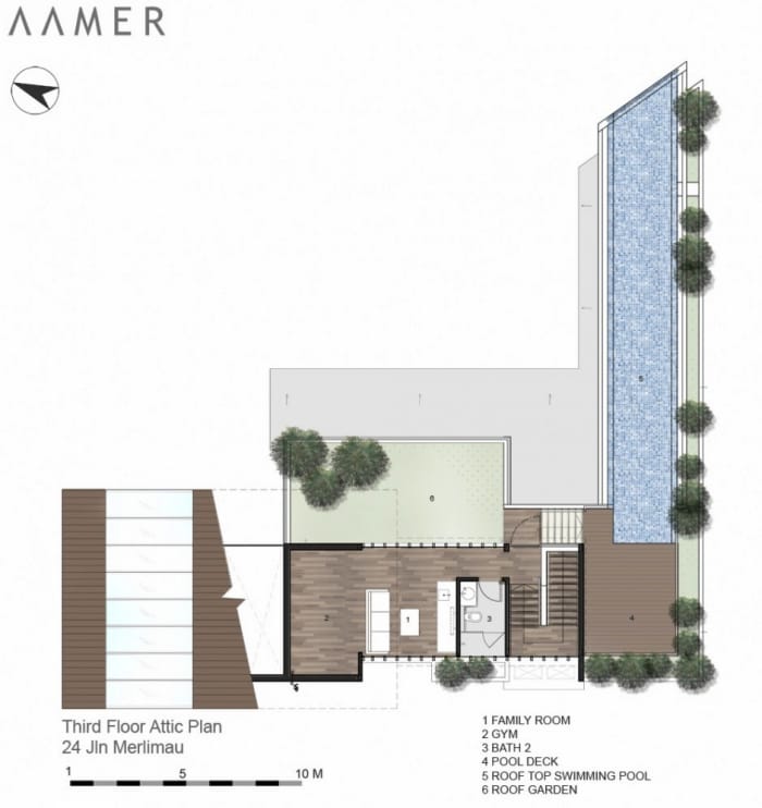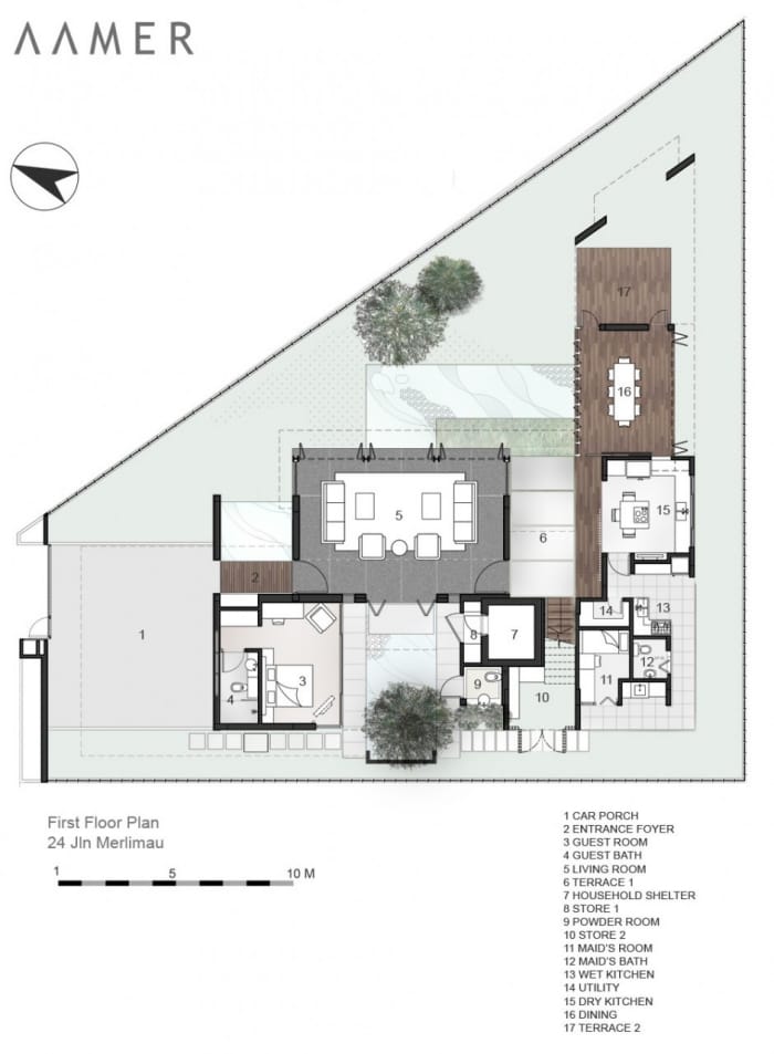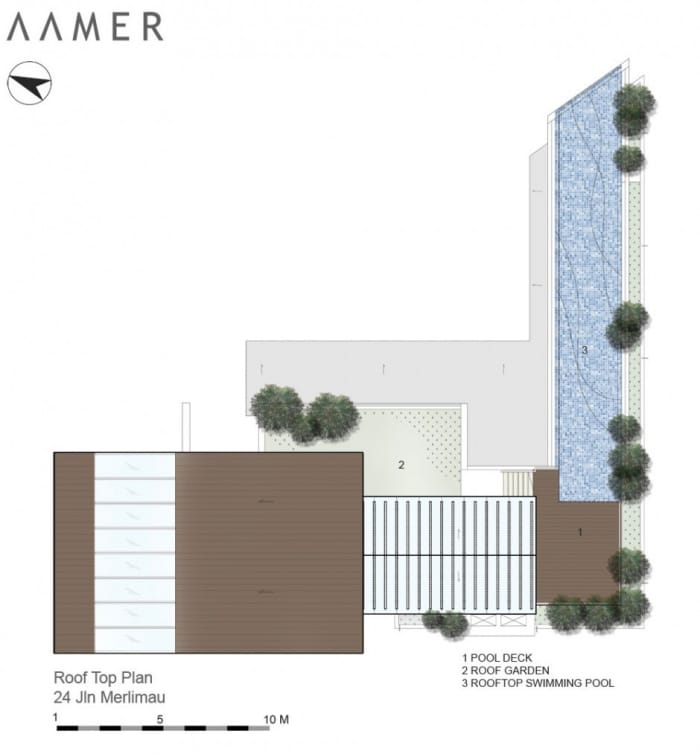 La Casa Merlimau está ubicada en una barriada residencial de Singapur. Este proyecto debiera llamar nuestra atención por la manera en la que se resolvieron las limitaciones físicas del sitio. La parcela no era muy grande, y a pesar de su geometría triangular, el arquitecto se sacó de la manga una casa con habitaciones más que aceptables. Tampoco renunció a los espacios exteriores que el cliente deseaba, pues diseñó una azotea con piscina y terraza ajardinada.