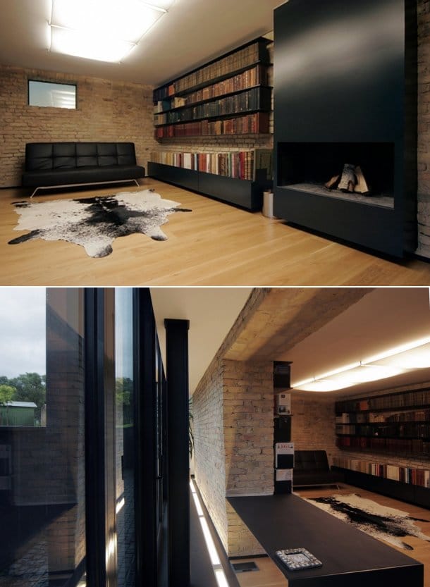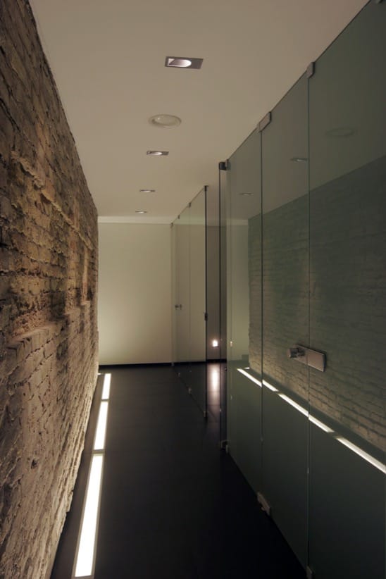 Hay que destacar el fuerte contraste entre los tonos oscuros, y el color cálido de los muros de ladrillo. El resultado es una decoración minimalista, donde el ambiente es creado por la propia arquitectura y el mobiliario. No hay adornos.