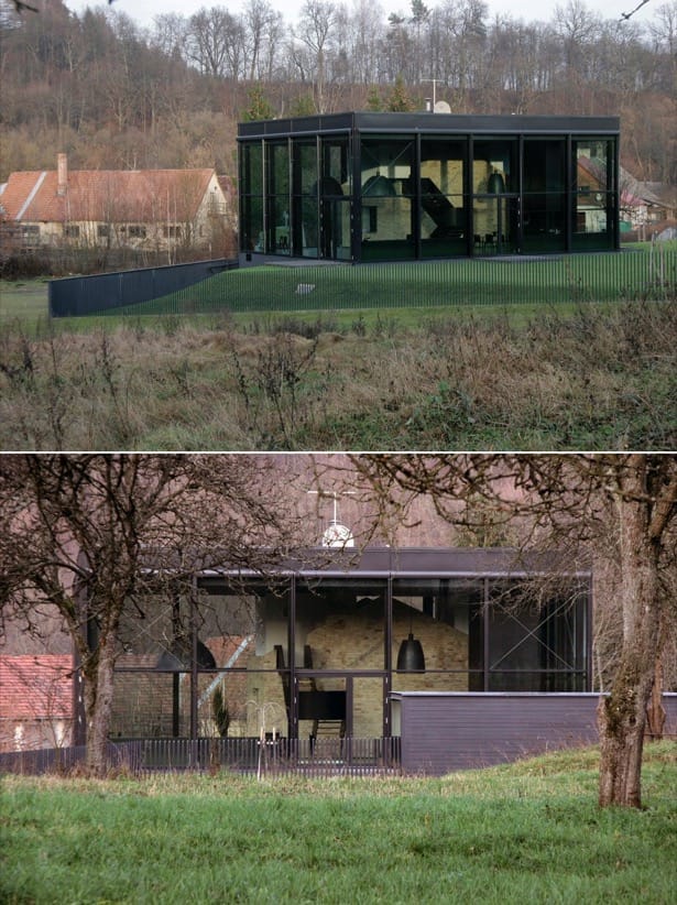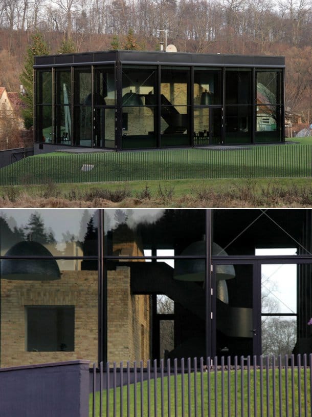 La vivienda que se ve en las imágenes se construyó para un banquero, que además era coleccionista de libros antiguos. Es Pavilniai House, se hizo para una familia de cuatro miembros, y está ubicada cerca de la capital lituana (Vilna). El sitio estaba ocupado por una construcción que antiguamente (Edad Media) funcionaba para la fundición de cañones. Era un edificio con sótano, construido con muros de ladrillos amarillos, procedentes de Vilna. Por su valor histórico, estos muros fueron restaurados, y se exhiben en la nueva vivienda, que actúa como una urna de cristal que los protege.