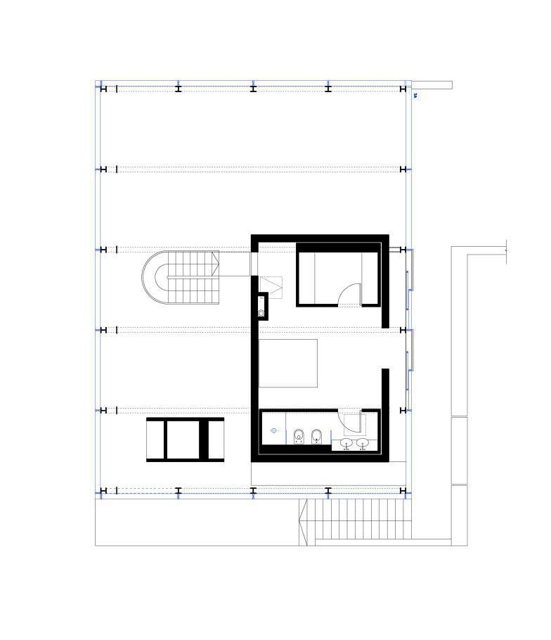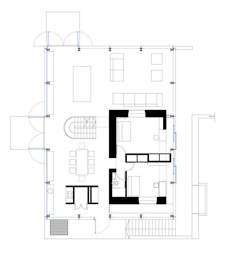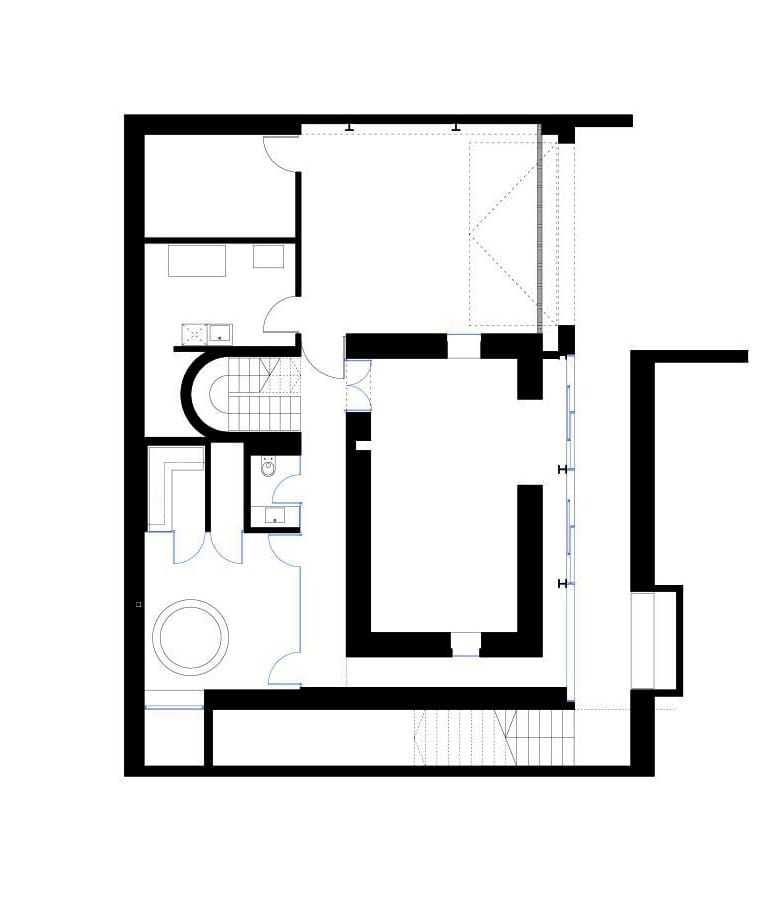 Debido a la topografía en ladera de la parcela, la entrada al garaje es bastante cómoda por el sótano. En este nivel también se ha colocado el cuarto de instalaciones, lavadero, y corredor con un lateral completamente de vidrio. Al otro lado de la pared acristalada está el aseo, y un baño turco con salas de descanso.