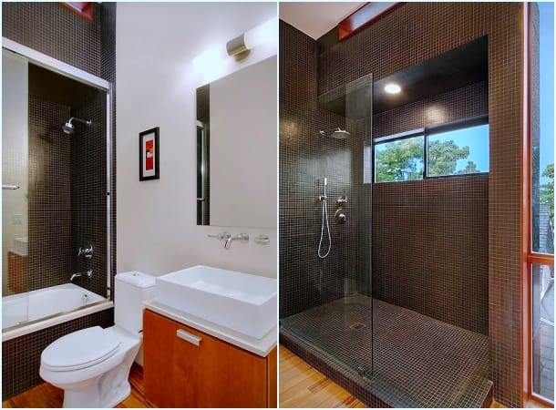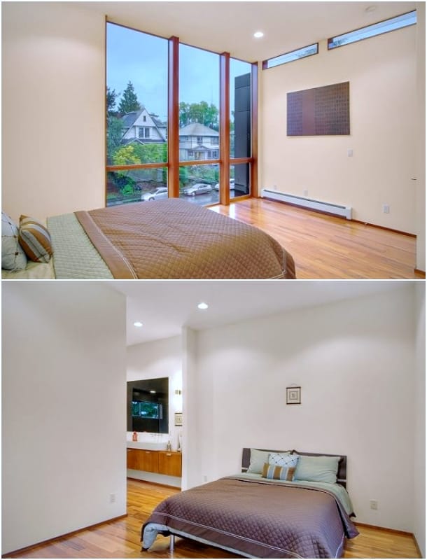 En la Residencia 12th & John hay un total de 3 dormitorios. Encontraremos el primero de ellos en la planta baja (first floor), justo en la entrada. Los otros dos dormitorios están en el tercer piso (ver plano), pero todos tienen buen tamaño y armarios empotrados. El dormitorio principal en vez de armario empotrado tiene un vestidor; además incluye un cuarto de baño con ducha, que llama la atención por sus dimensiones, y por el panel de vidrio lateral. En esta misma planta está el cuarto de baño general, mientras que en la planta intermedia (second floor) hay un aseo.