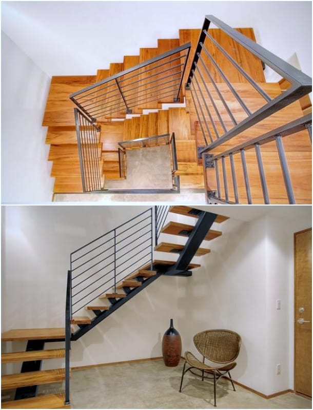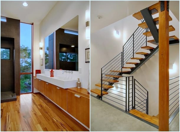 Toda la escalera de la casa está diseñada con tablones de madera, colocados sobre una viga metálica central. Nótese que en todo su recorrido no hay elemento alguno que haga de tabica.