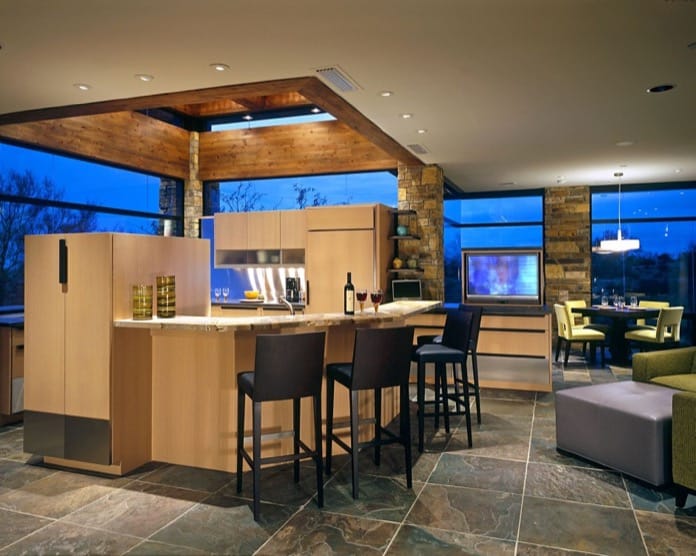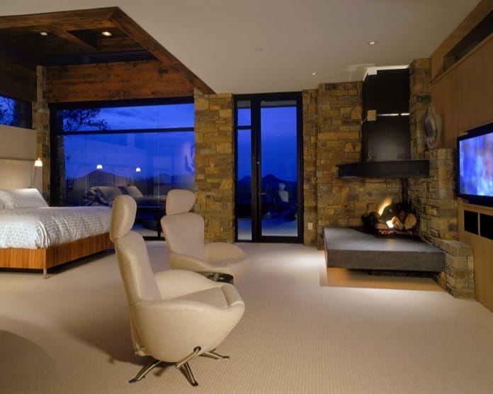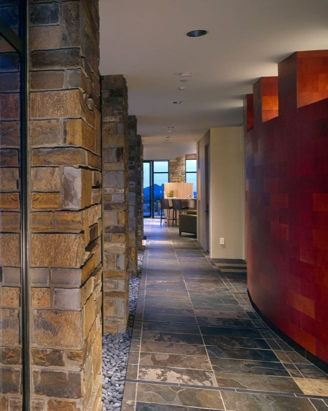 El programa de esta residencia privada incluye una gran sala de estar, situada al final del eje de acceso. Es un espacio impresionante, con techos altos de madera, muros de piedra, y buena iluminación natural. En este proyecto tampoco se ha escatimado en superficie: el baño del dormitorio principal es tan grande como el propio dormitorio. Cada uno de los otros dormitorios tiene baño incluido, y en el resto de la vivienda se produce una interesante jerarquización de funciones.