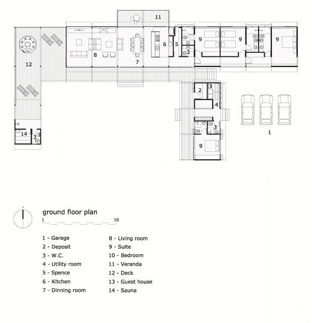 Esta vivienda tiene otros dos módulos perpendiculares al volumen principal. Todos ellos conforman un patio abierto hacia el sur. El módulo oeste contiene una terraza con pérgola, que da sombra a una zona de baño (jacuzzi). En su extremo hay un aseo y una sauna. En el segundo módulo hay una casa para huéspedes. Este volumen no es más que un dormitorio con baño, y unos cuartos de servicios (depósito, lavadero, almacén).