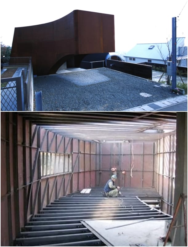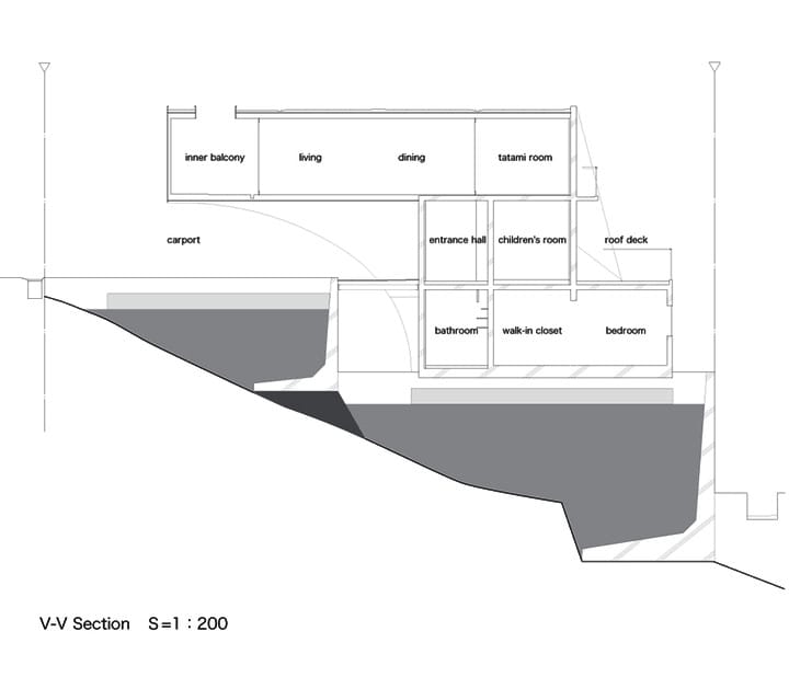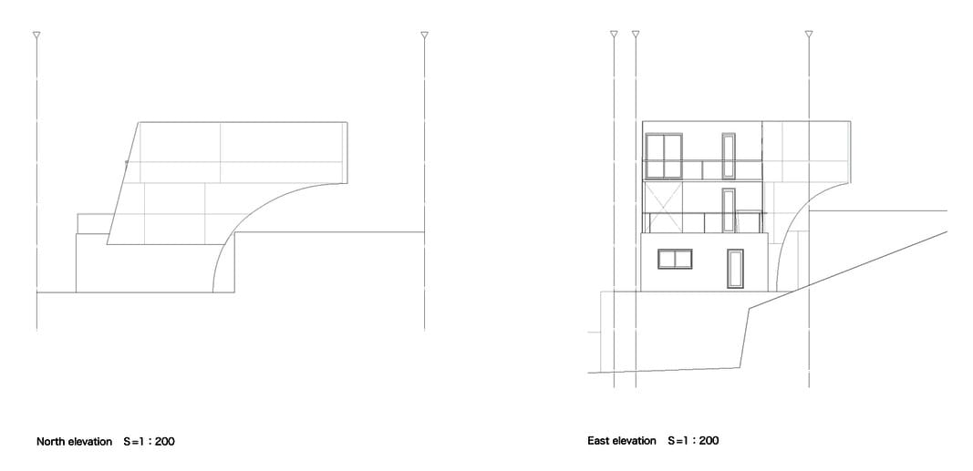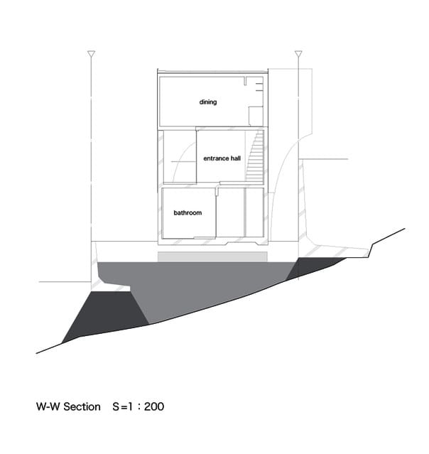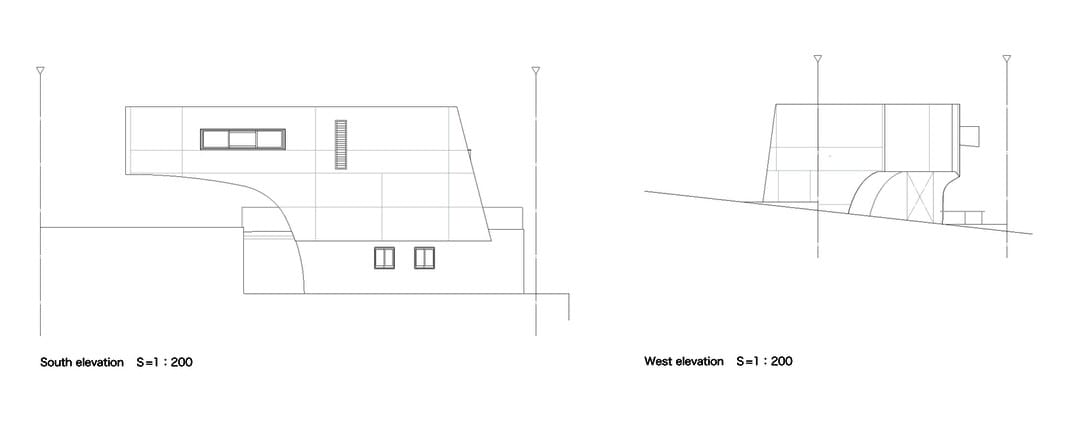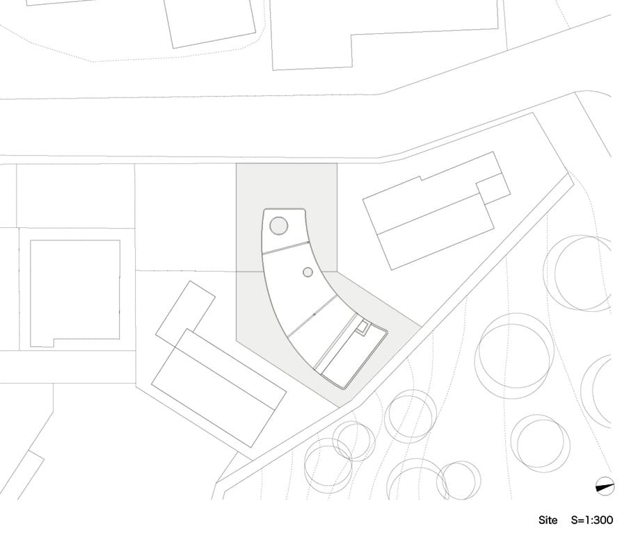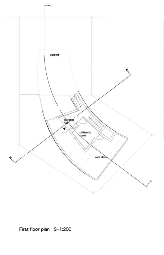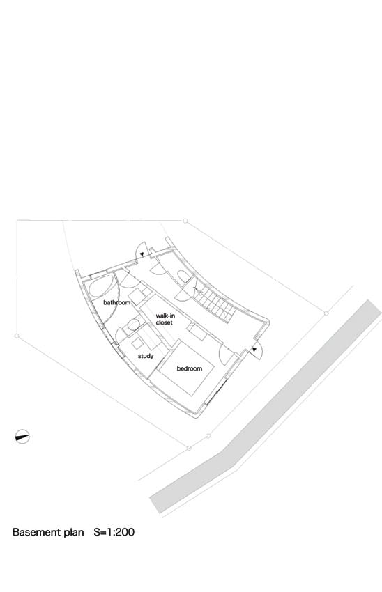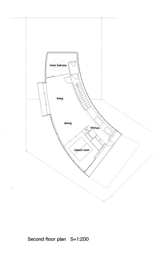 Para comprender la forma de la Ship House es preciso conocer antes la naturaleza del terreno. Se trata de una parcela de Nishinomiya (Japón), con 194m2, en la que se pueden construir dos plantas. Pero hay un desnivel de 3 metros, y unos condicionantes de cimentación una tanto severos. El arquitecto adaptó un programa de 2 dormitorios en un volumen de trazado curvo, que se adapta perfectamente al sitio.