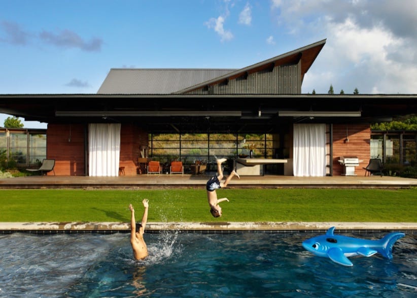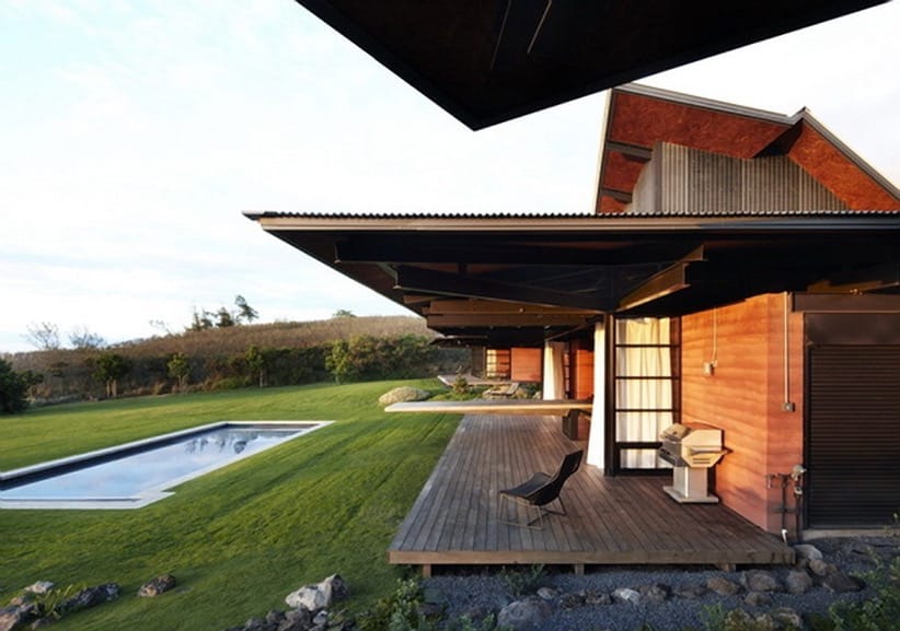 Lo más llamativo -para bien o para mal- de esta casa son sus cubiertas, y los amplios vuelos que dejan más allá del plano de fachada. Este gesto en su diseño favorece bastante la creación de terrazas y porches, necesarios para disfrutar de la vida hawaiana al aire libre.