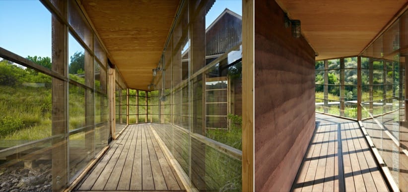 Por último, añadir que la construcción de algunos muros de fachada y paredes se hizo con técnicas de tierra apisonada. Se utilizaron diferentes mezclas locales, consiguiendo una textura bastante peculiar que dialoga muy bien con el entorno. La estructura principal está hecha con perfiles de acero.