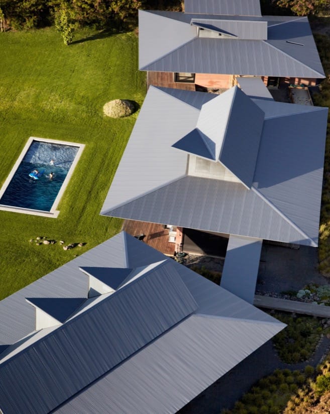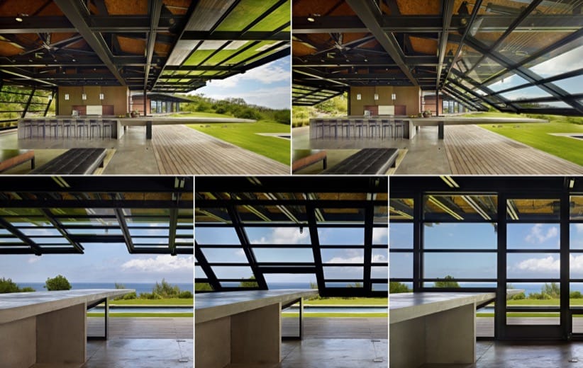 Las cubiertas están hechas con chapa metálica corrugada, y presentan un diseño “turboalimentado”. Su geometría está alterada en algunos puntos con el fin de facilitar que la brisa extraiga el aire caliente del interior de la casa. Es una clara alusión a los tejados tradicionales hawaianos, tan popularizados por las obras del arquitecto Charles William Dickey.