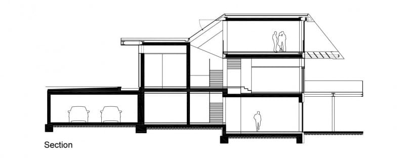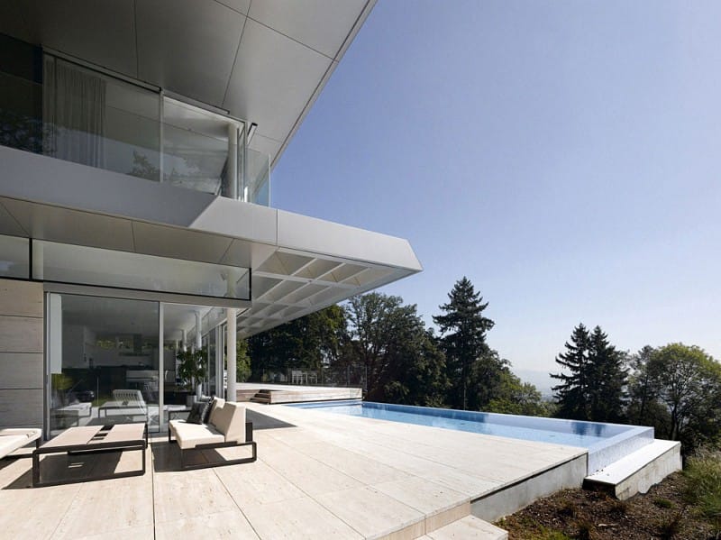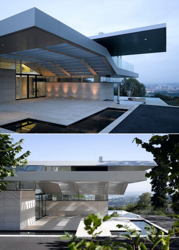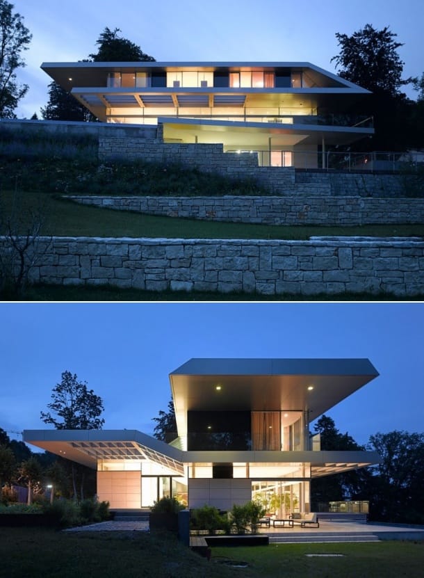 Los arquitectos se plantearon el objetivo de integrar el edificio con la topografía del terreno, creando unos límites difusos. También estamos ante una casa en ladera con acabados de lujo, y unas estructuras voladas muy potentes.