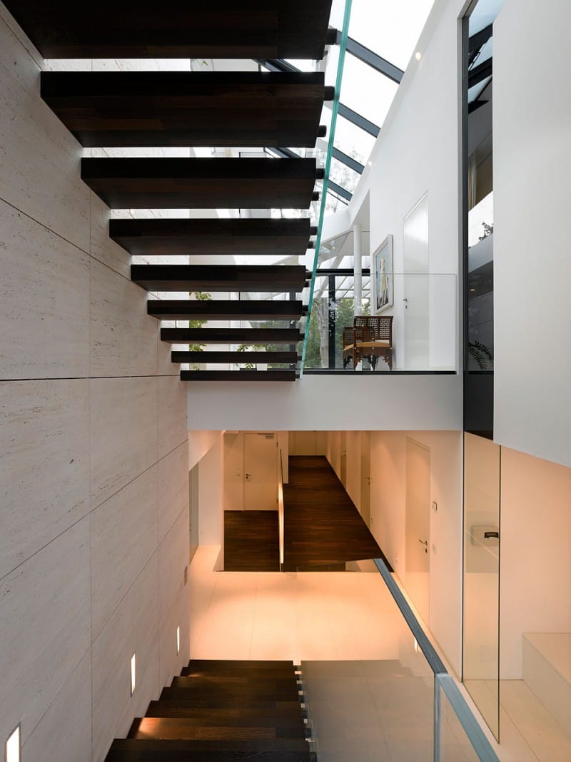 La zona central de la casa, con techo a doble altura, actúa como una chimenea que ventila los espacios interiores. En este sentido, el lucernario inclinado cumple una función muy importante.