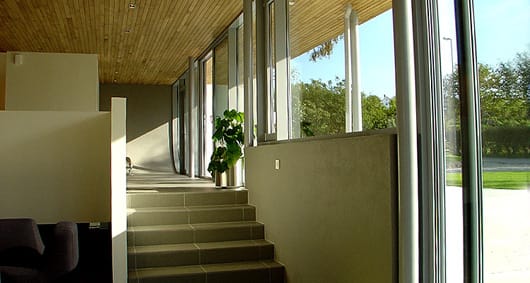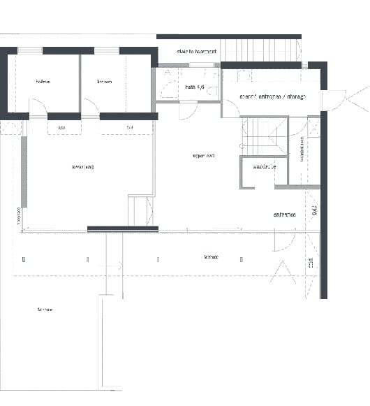 A pesar de que el terreno tiene cierto desnivel, los dos puntos de acceso al edificio se hacen por el mismo plano de planta baja (el más alto).