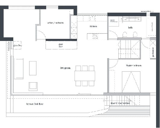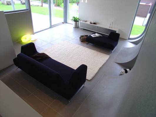 No encontramos motivo aparente que justifique la cocina arriba, a menos que el propietario utilice la planta baja para trabajar. En ese piso existen dos niveles, uno para el vestíbulo, aseo, y cuartos de almacenamiento. En el otro hay una sala, y dos pequeñas habitaciones, siendo difícil adivinar su función. Debido al desnivel de planta baja, la sala principal es la zona con mayor altura libre de toda la vivienda.