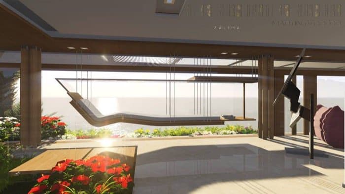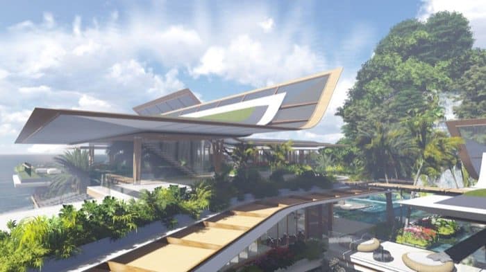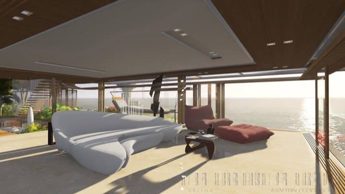 El interior de Water Pavilion responde perfectamente a lo que podíamos esperar de una casa de lujo contemporánea. Se utilizaron materiales nobles que revisten y delimitan estancias llenas de luz, manteniendo en todo momento las mejores panorámicas hacia la isla. El proyecto además incorpora la vegetación, y un mobiliario muy selecto. La curva que se le ha añadido a algunos de los voladizos de la cubierta, le da bastante singularidad al edificio, lo convierte en una casa inconfundible.