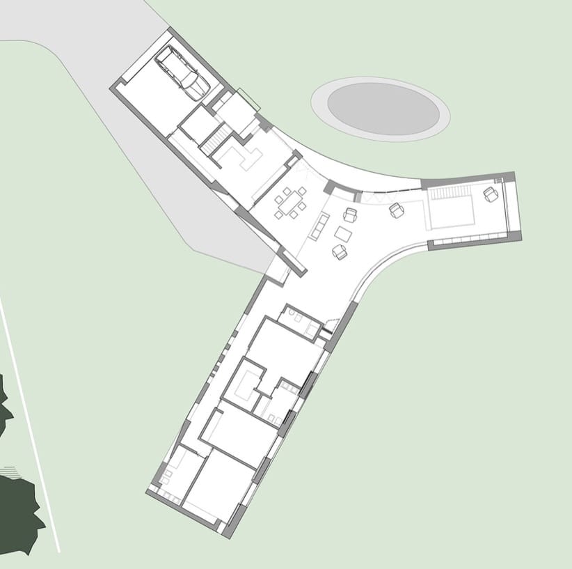 En esta casa en Y cada ala reúne las funciones más comunes, a la vez que sirve para diferenciarse del resto. Por eso en una de ellas está el garaje y la cocina, en otra todos los dormitorios, y en la más pequeña se ubica una biblioteca. Esta última no es más que una prolongación del salón, que ocupa el área central de toda esta Y.