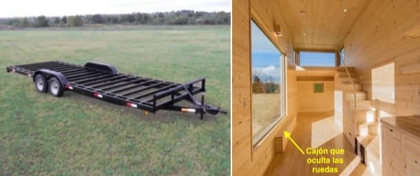 Hay que tener en cuenta que en estas viviendas sobre remolque puede aparecer en su interior (en el piso), unos volúmenes que ocultan las ruedas. En la siguiente imagen hay una foto en la que se ve el aspecto del remolque. En la otra se ha señalado el volumen que invade el interior.