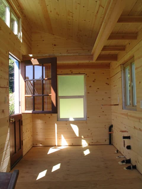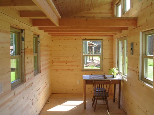 La compañía Oregon Cottage se dedica a diseñar y construir pequeños bungalows móviles de madera. Están hechos a medida, y según las necesidades del cliente, ya sea para funcionar como hogares, oficinas, talleres, etc. Estas imágenes corresponden a la mini casa ALSEK, que tiene un estilo clásico pero con un diseño atípico. Es un modelo enfocado a clientes que desean una construcción de bajo coste, con mucha luz, y sin terminar del todo. Esto permite que luego el propietario la pueda personalizar a su gusto.