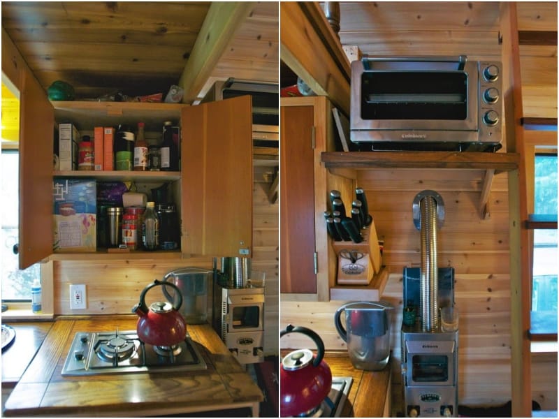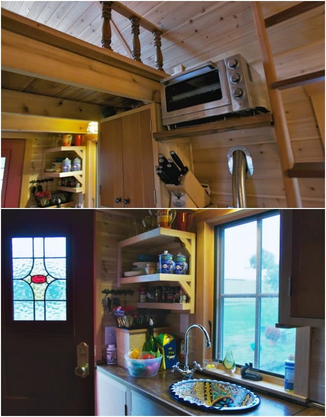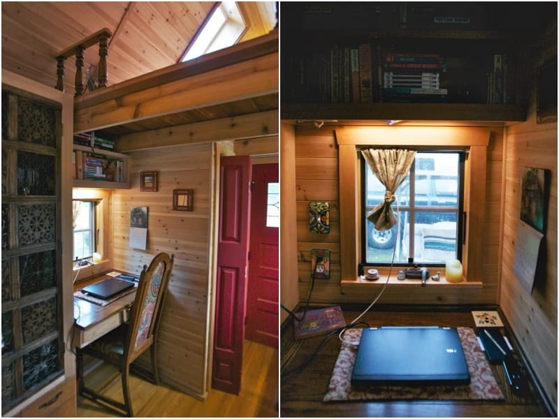 Al fondo de la sala hay un banco con forma de L, que en su interior guarda herramientas y diversos enseres. Solo hay una mesa, una silla normal y otra plegable, y una escalera de madera para subir al loft (altillo). Allí arriba hay un colchón de futón que sirve de cama. El interior tiene un acabado de madera un tanto clásico, que está muy bien aprovechado con diversos estantes y armarios. Todo ello gracias a las habilidades de su novio, que es carpintero. El exterior es de cedro rojo.