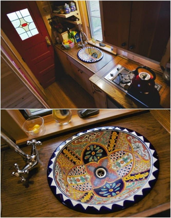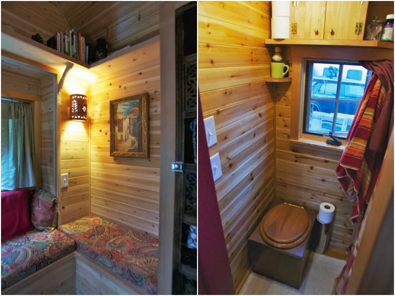 En esta pequeña casa de madera el cuarto de baño no tiene lavabo, y mucho menos bañera. Hay que conformarse con una estrecha ducha, y una vez al mes vaciar el inodoro de compostaje. Tampoco se duerme en una cama normal, ni hay sofá, televisión, lavadora, o lavavajillas. Michelle ahora mismo vive en un parque para caravanas (en Portland), pero podría hacerlo en cualquier otra parte, ya que se trata de una casa sobre un remolque. Por tener su hogar estacionado allí, paga un reducido alquiler que incluye el agua potable. Eso sí, la colada la hace en unas instalaciones de la comunidad.
