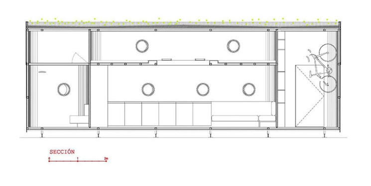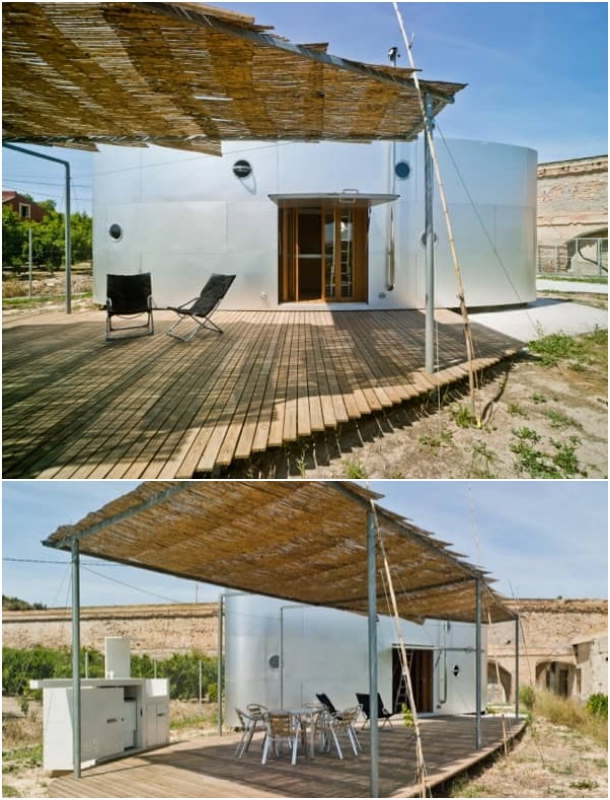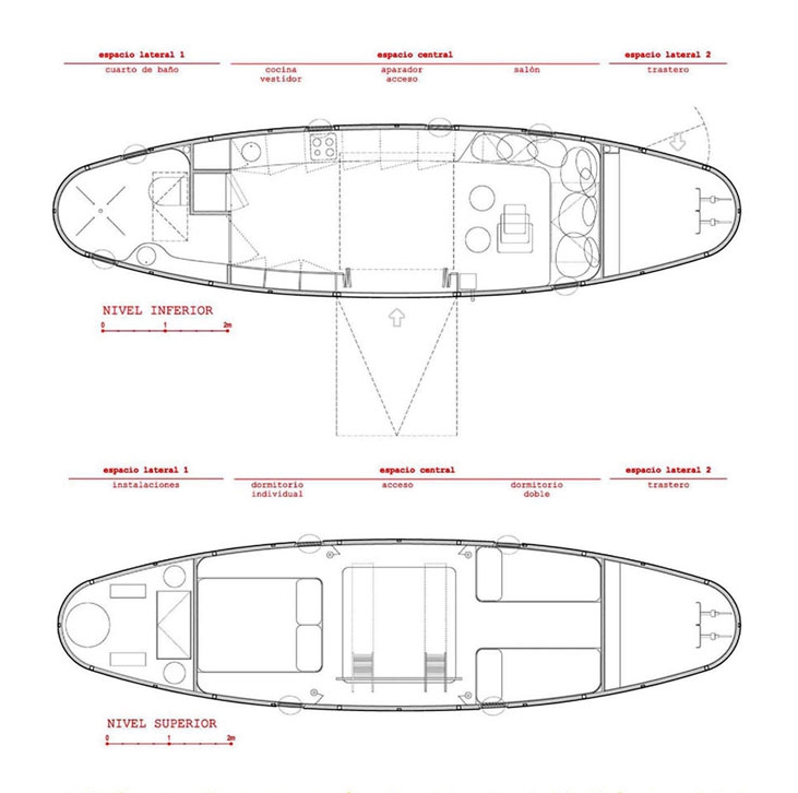 En este diseño de planta casi elíptica, los extremos se han ocupado con las funciones que menor grado de habitabilidad requieren. En uno de ellos está el baño, con un espacio para instalaciones en la parte superior; el otro se ha destinado a cuarto de almacenamiento, siendo accesible desde una puerta exterior.