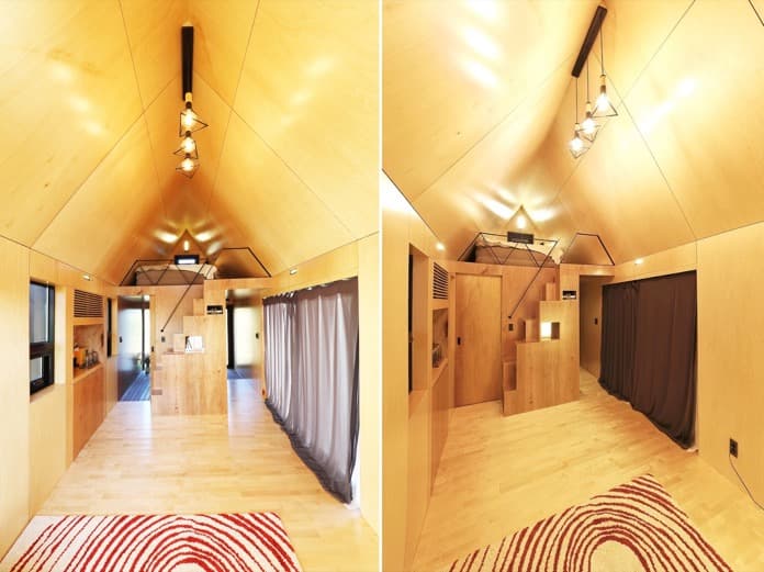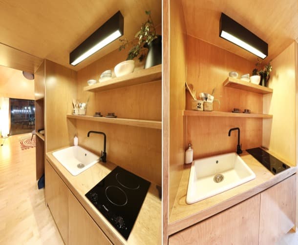 Como se puede apreciar en las fotos, el interior de esta tiny house está revestido de paneles de madera, que le aportan una textura lisa y moderna.