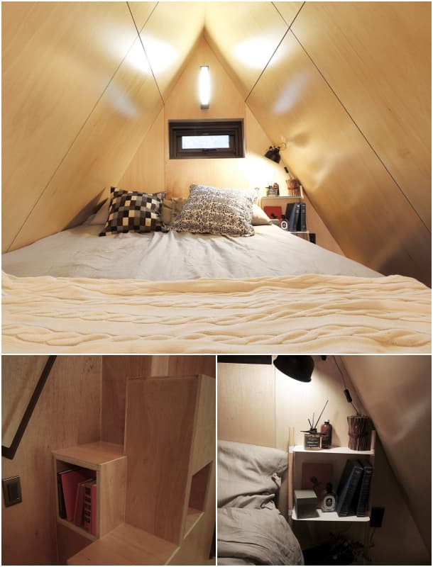 La gran inclinación de los faldones de cubierta aumenta la habitabilidad del altillo, que como suele ser habitual en estas construcciones, está destinado al dormitorio. La cama se coloca a un lado, dejando el resto del espacio libre. Ahí se ha dispuesto una pequeña estantería-mesita de noche. Un detalle especial es la escalerilla de acceso al altillo, pues funciona también como un estante de almacenamiento.