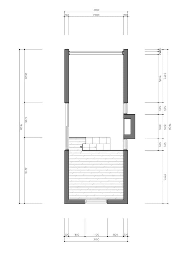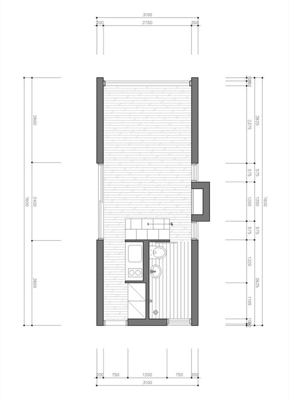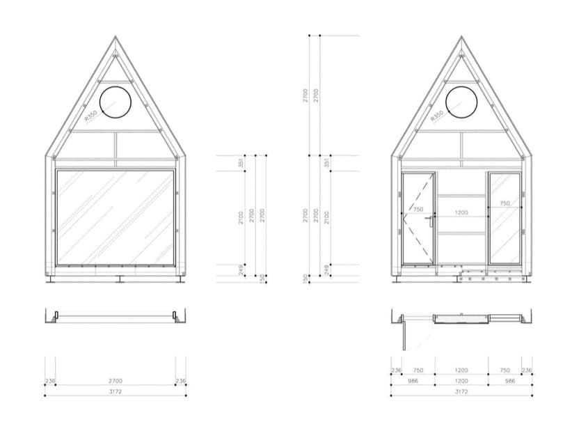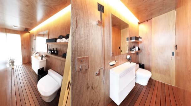 Lo primero que sorprende de esta casita es la variedad de huecos: cuadrados, rectangulares, y uno circular arriba. Dos de ellos sirven de acceso a la casa. El principal está definido por una doble puerta corredera que conecta la sala con una terraza. La otra puerta está en la cocina. La casita Slow Town también cuenta con cuarto de baño, que está revestido en su totalidad con madera. Las tablas del suelo dejan espacio para el desagüe del agua de la ducha. Es un detalle poco frecuente, que hace que el espacio se vea aún más grande de lo que es.
