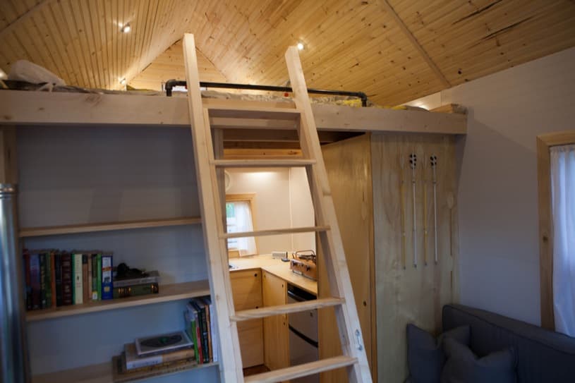 El cuarto de baño está separado por una puerta corredera, y tiene una ducha con un inodoro de compostaje. La cocina está equipada con un refrigerador-congelador, una antigua cocina a gas, fregadero, y numerosos cajones, además de un armario lateral. Como viene siendo habitual en este tipo de casas móviles, hay un altillo con una cama de matrimonio arriba, accesible por una escalerilla de madera.